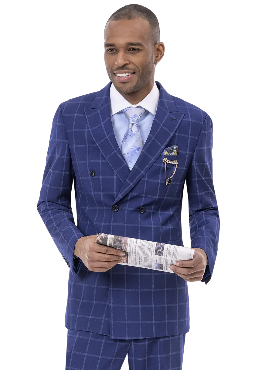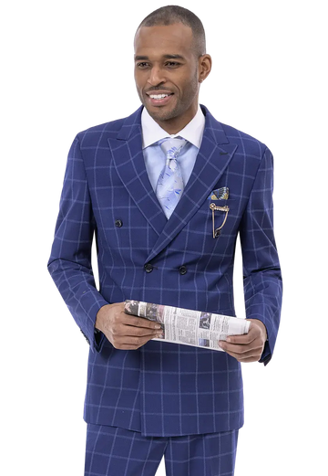 - Bold Elegance: Make a statement with the sharp double-breasted windowpane design in a striking fashion blue.