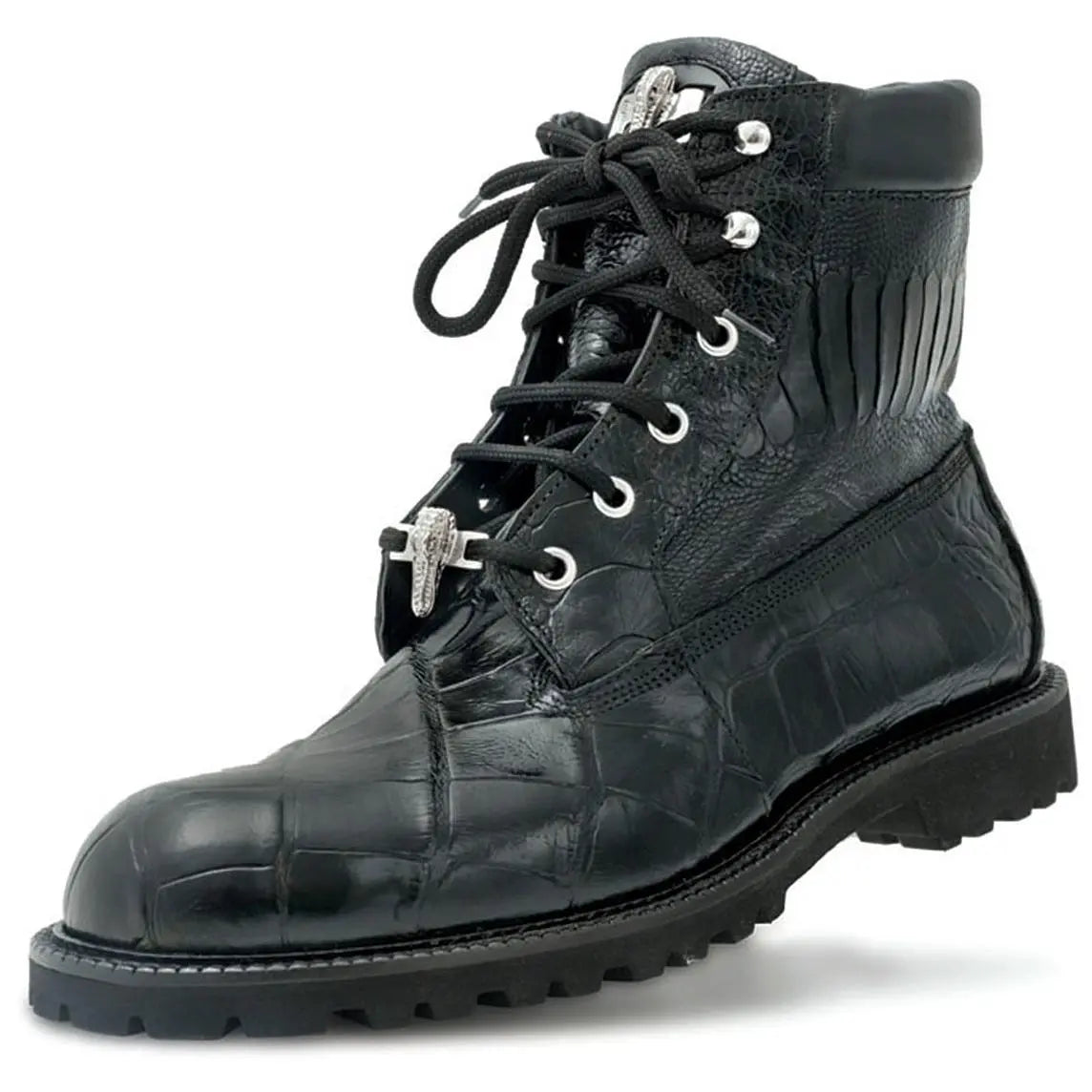 Mauri Commando 4637 Black Genuine Alligator/Ostrich Leg/Calfskin Lace-Up Boots