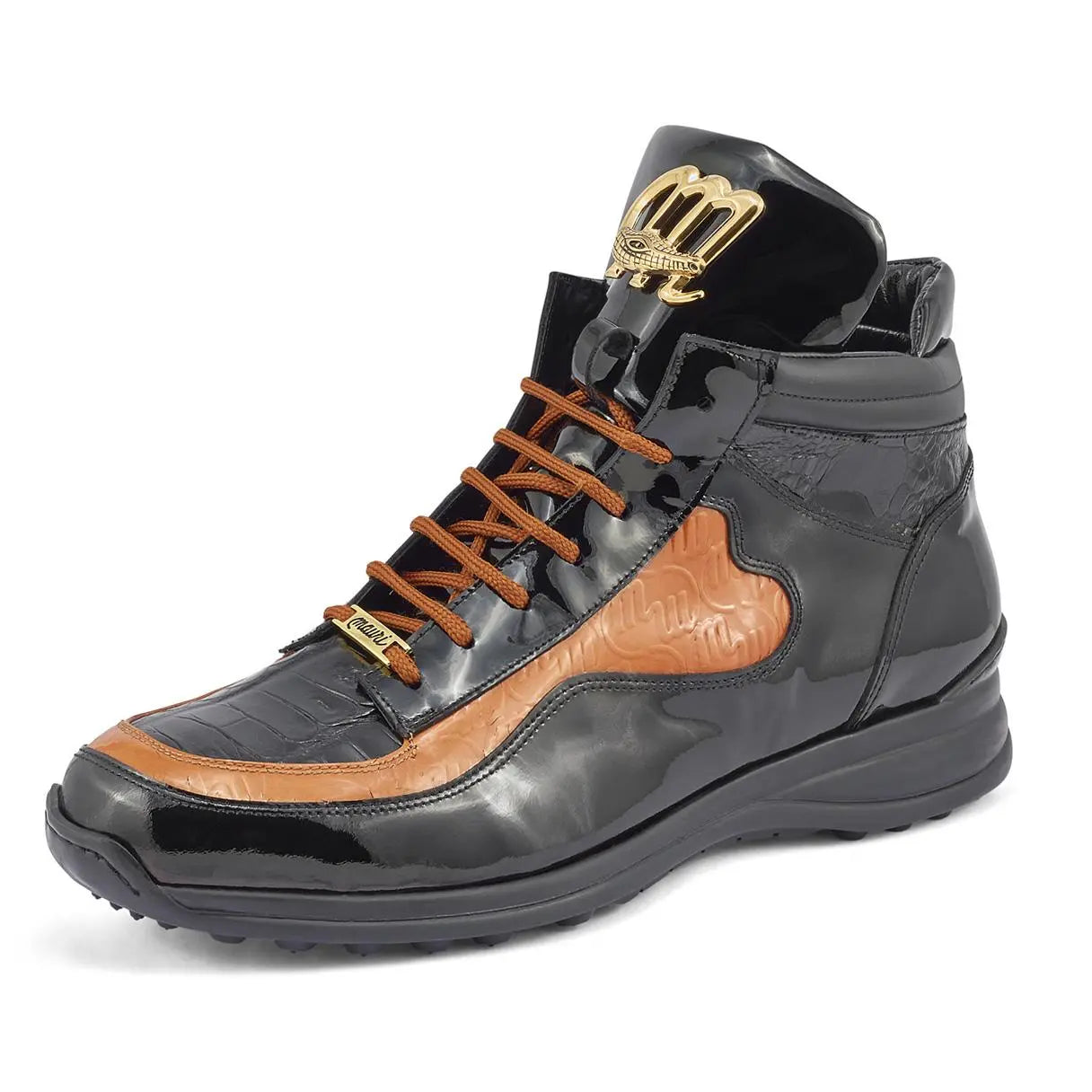 Mauri Hype Black/Cognac Genuine Crocodile/Ostrich Leg/Patent Leather High-Top Sneakers 8409