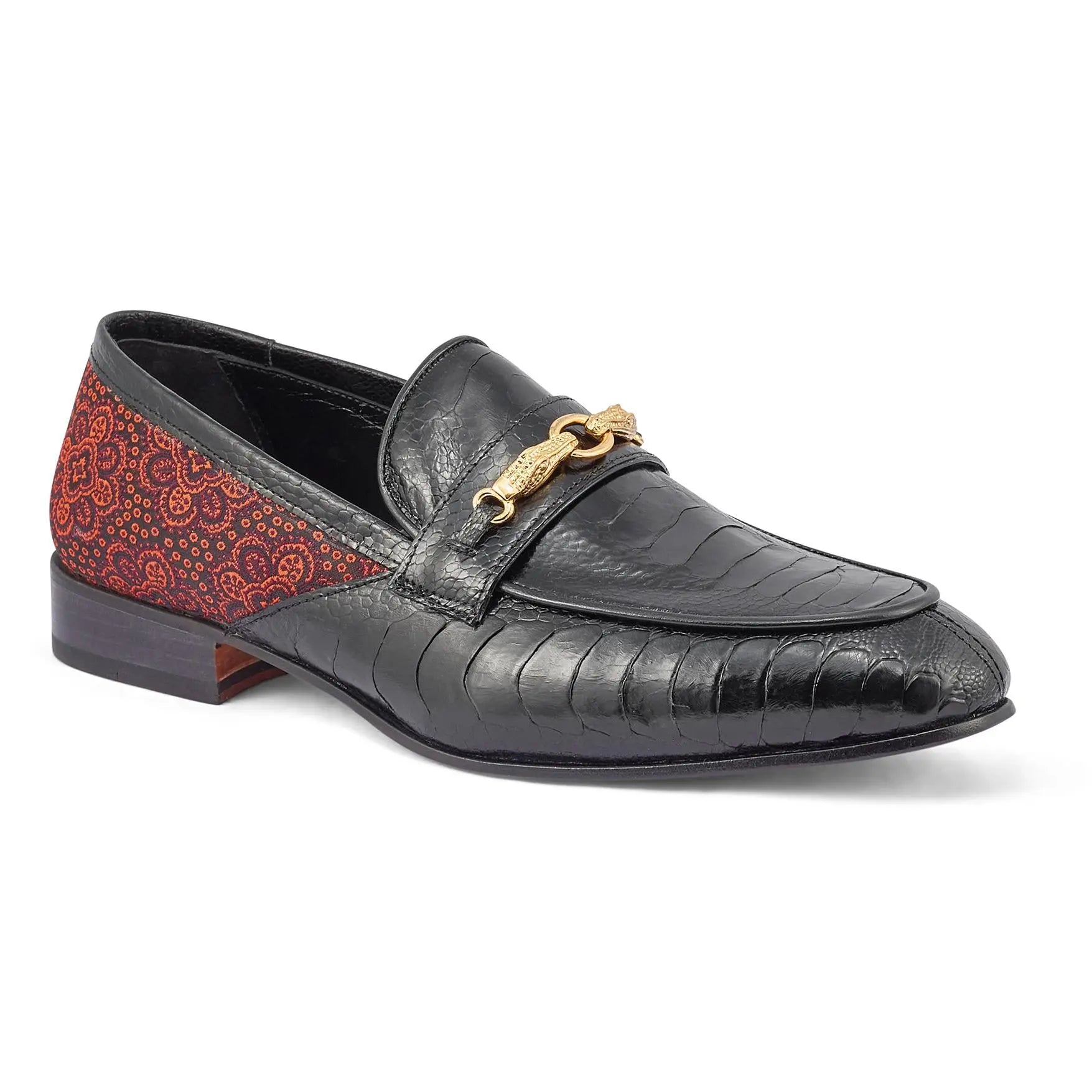 Mauri Monet Black/Coral Red Genuine Ostrich Leg/Matahari Fabric Horsebit Loafer Shoes 4946