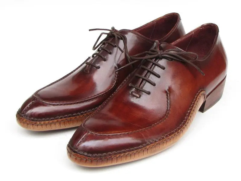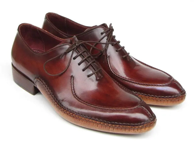 - Side handsewn split-toe men's oxfords. Burgundy hand painted leather upper with leather sole and bordeaux leather lining.